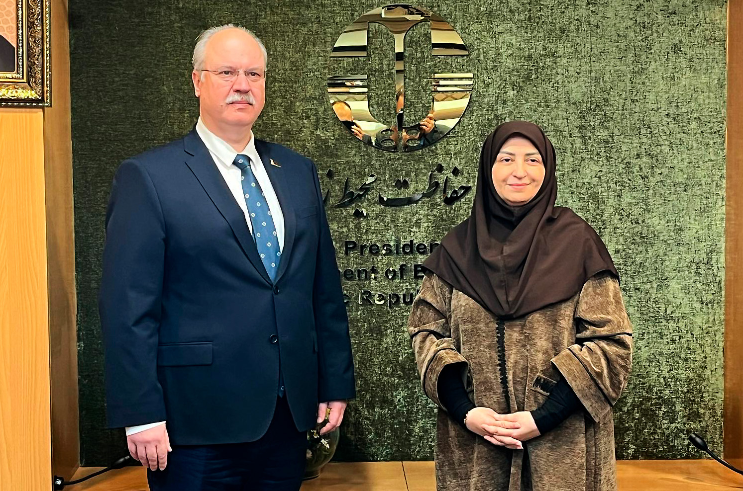 7 снежня 2025 г. Надзвычайны і Паўнамоцны Пасол Рэспублікі Беларусь у Ісламскай Рэспубліцы Іран Дзмітрый Кальцоў сустрэўся з Віцэ-прэзідэнтам Ірана, кіраўніком Арганізацыі па ахове навакольнага асяроддзя Шынай Ансары.