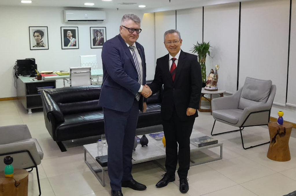 29 красавіка 2025 г. Надзвычайны і Паўнамоцны Пасол Рэспублікі Беларусь Рэспублікі Беларусь у Баліварыянскай Рэспубліцы Венесуэла Андрэй Молчан сустрэўся з Міністрам прадуктыўнай сельскай гаспадаркі і зямель Хуліа Сезарам Леонам Эрэдыя.