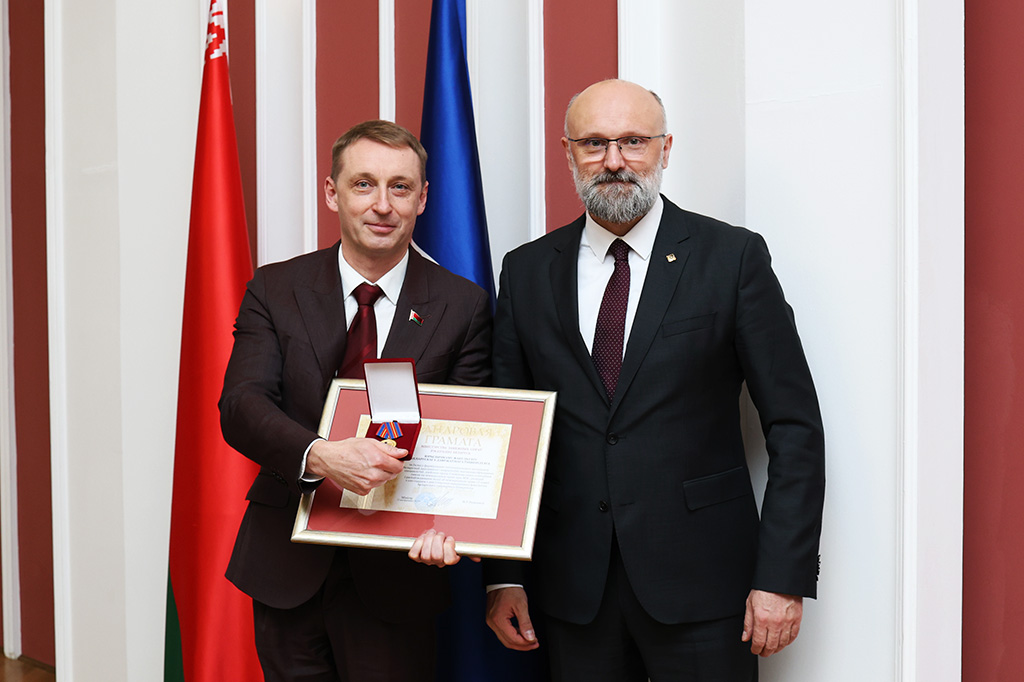 За многолетнюю работу по подготовке юридических кадров, развитие и популяризацию научных знаний о международном праве, плодотворную деятельность в составе Научно-консультативного совета коллектив юрфака БГУ был награжден Почетной грамотой Министерства иностранных дел Республики Беларусь, декан юридического факультета БГУ Андрей Шидловский – медалью «100 лет дипломатической службе Беларуси».